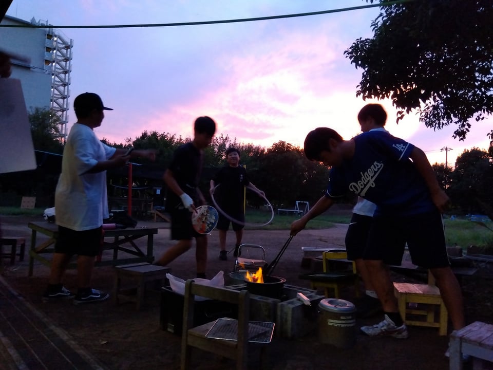 火を囲んで、食べ物を焼いたり、話をしたり、テーブルゲームをしたり、思い思いに過ごしています。