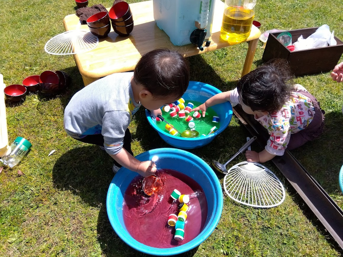 うらっこ広場から、いつものあそび道具(色水やコマ・ベーゴマ・けん玉など)を持って当代島公民館にあそびに行きます。