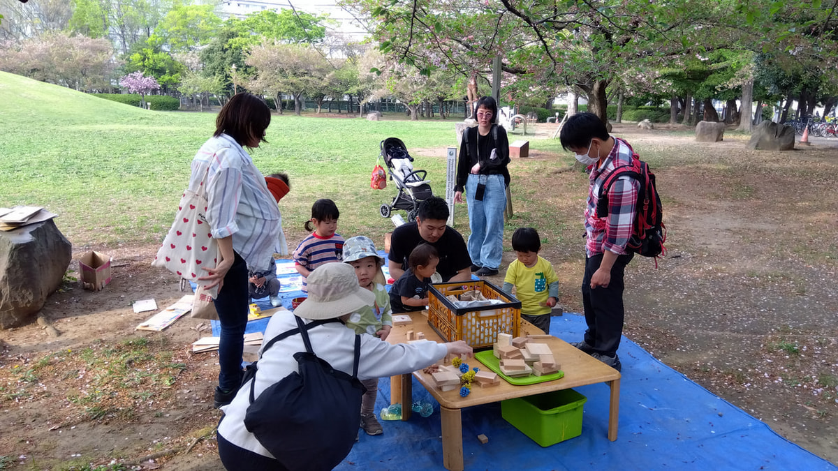 うらっこ広場から、いつものあそび道具(色水やコマ・ベーゴマ・けん玉など)をもって若潮公園に遊びに行きます。
